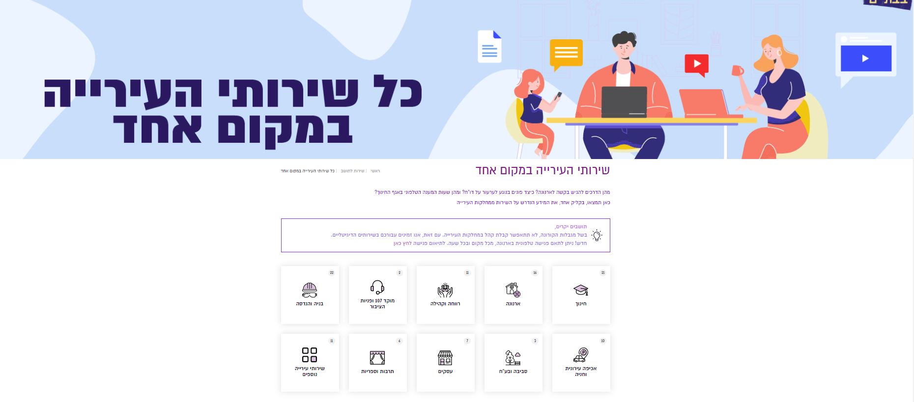 מטרת הדף היא כי לתושב תהיה את האפשרות לבחור את קטגורית השירות המבוקש: ארנונה. הנדסה ובינוי. חינוך. רווחה וכו'. תחת כל קטגוריה הם ימצאו את שירותי העירייה המוצעים. תחת כל שירות יוכל התושב: לגשת בקלות לשירות בקליק- השירות הדיגיטלי המוצע עבור מה שמחפש כמו: שעות פעילות. ופרטי הפנייה של השירות הטלפוני וקבלת הקהל ביחידה/הגורם האחראי לשירות המבוקש.